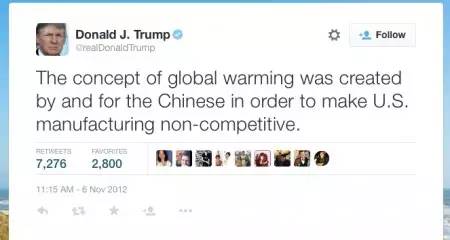在2016年竞选期间,特朗普誓言退出巴黎协定。他坚称这是中国搞出来的“骗局”,并认为它将伤害到美国经济。而在更早的2012年,他就曾在Twitter上的一条帖子中写道,“全球变暖是中国为了自己的利益生造出来的概念,目的是让美国制造业缺乏竞争力”。那条帖子被转发超过10万次,获得点赞近7万次,可见这种观点在美国国内确实拥有很强的民意基础。