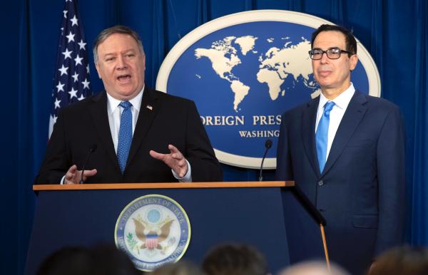 当地时间2018年11月5日上午,美国首都华盛顿,国务卿蓬佩奥(左)和财长姆努钦在记者会上宣布美国制裁伊朗的细节。 东方IC 图