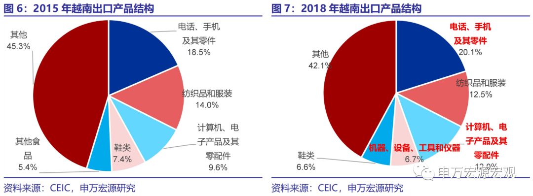 越南则呈现出一种工业化、机械化加速的普遍特征。对一个出口高速增长的经济体而言,我们可以认为,出口占比持续提升的产品品类,实际上勾勒出这个经济体出口高速增长的主要动力。对比2015年和2018年越南的出口产品结构,我们发现两大主要特征:1)电子产品和机械产品占比快速提升,电话、手机及其零件、计算机电子产品及其零件、以及机器设备工具和仪器三大类出口占比分别提升1.6、2.4和1.7个百分点,占出口额的比重由33.1%大幅上升至38.8%。2)纺织品和服装、鞋类两大类商品尽管均出现于前五大类出口商品中,但占比分别下降1.5和0.8个百分点。两大特征综合显示,越南出口产品正在呈现较为全面的工业化、机械化电气化升级特征,或将在未来对我国出口形成更为明显的替代和竞争效应。