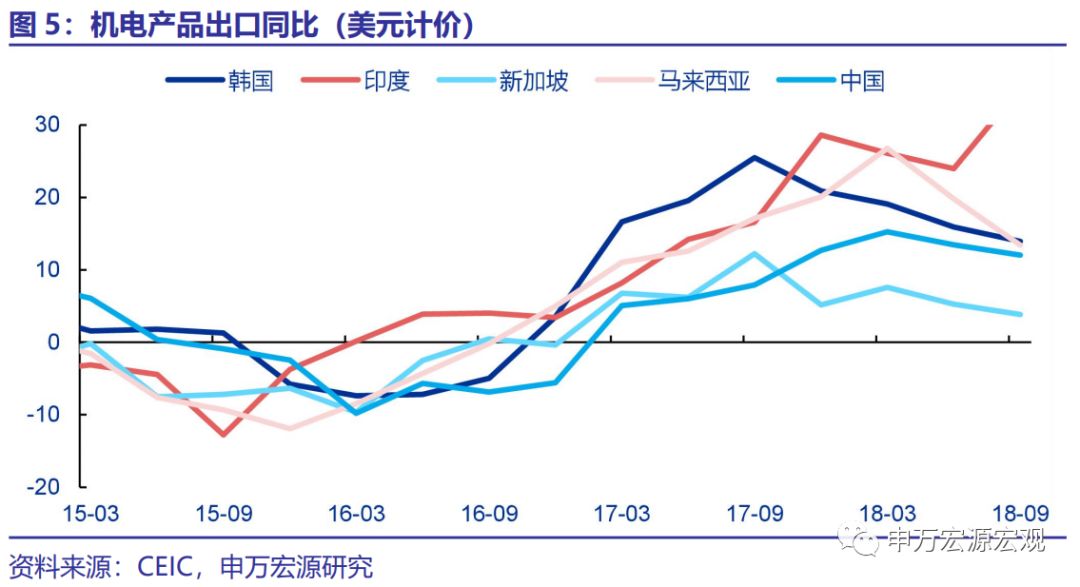 从各国近年来出口同比增速中,亦同样显示越南、马来西亚是连续增速最快的两个国家。18年受全球贸易环境有所恶化的影响,韩国、印尼、泰国等国家的出口增速普遍较17年有所回落。其中,18年1-9月美元计价累计出口增速来看,韩国、印度、泰国、印尼分别较去年同期下滑13.8、2.9、1.2和7.9个百分点。新加坡、马来西亚出口增速显著上行,分别为15.2%和19.4%,而越南尽管相对17年的较高增速有所回落,但仍保持在相对较高水平(13.5%)。