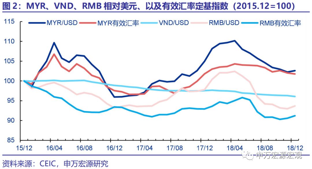 对于新兴市场出口高增的经济体,大家第一直觉往往是:该新兴货币是否刚刚经历大幅贬值,从而对出口形成促进?而从16年以来越南、马来西亚的汇率表现来看,可以说是相当稳健,贬值并非促进两国出口的主要原因。16年至18年,马来西亚林吉特有效汇率、相对美元分别小幅升值1.8%和2.6%,三年间波动范围大致在上下5%之内,整体稳健。越南盾对美元汇率趋势性稳中小幅贬值,3年累计贬值幅度亦仅3.9%左右。而相比之下,人民币汇率贬值幅度更大,3年来人民币相对美元累计贬值6.3%,人民币有效汇率贬值8.8%。综合来看,正如人民币汇率在较长时期内并非促进我国出口的最主要原因,越南、马来西亚近3年的出口高增, 亦难以认为是贬值的促进作用。