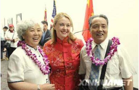 2008年6月19日,中国公民赴美旅游首发团的游客与美国旅游国际公司的董事主席兼CEO汉努瑶(中)在华盛顿国会山合影。(图片来源:中国网)