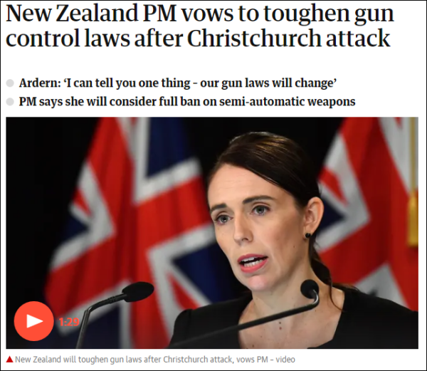 3月15日的新西兰枪击案夺走了49条生命,枪手甚至还直播了屠杀现场……在经历了这样一个“史上最黑暗的一天”后,新西兰总理杰辛达·阿德恩(Jacinda Ardern)16日在新闻发布会上承诺,将修改该国的枪支法,并考虑全面禁止半自动枪支。