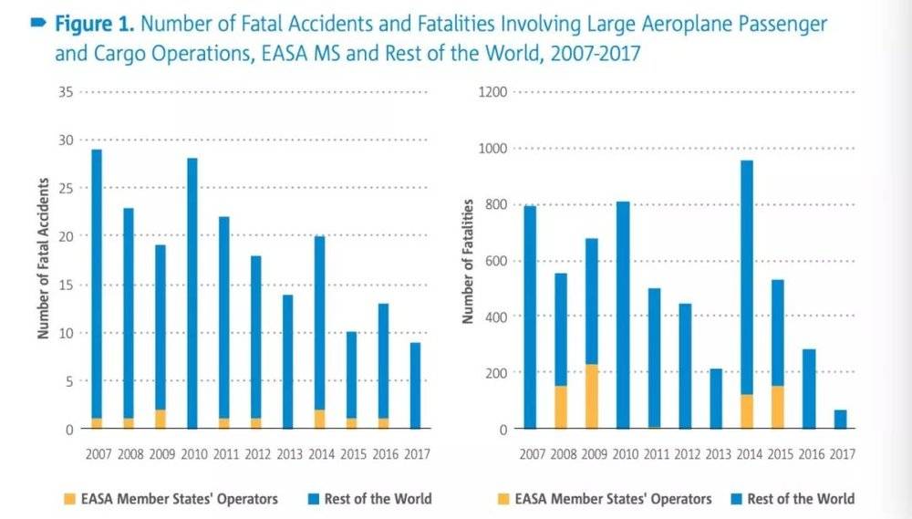 欧洲航空安全局在一个不同的调查中得到的结果大致相同。从2007年到2017年这样一个短距离的衡量中,事故的发生率和人员伤亡率也是有比较稳步的下降。虽然还是有起跌。