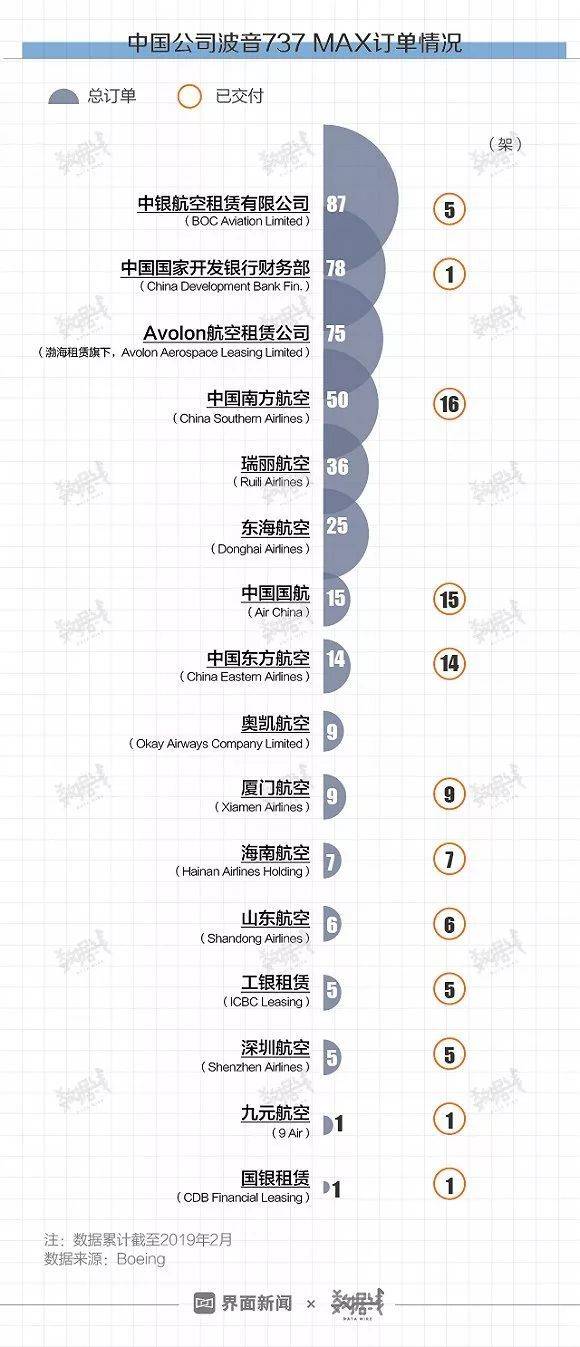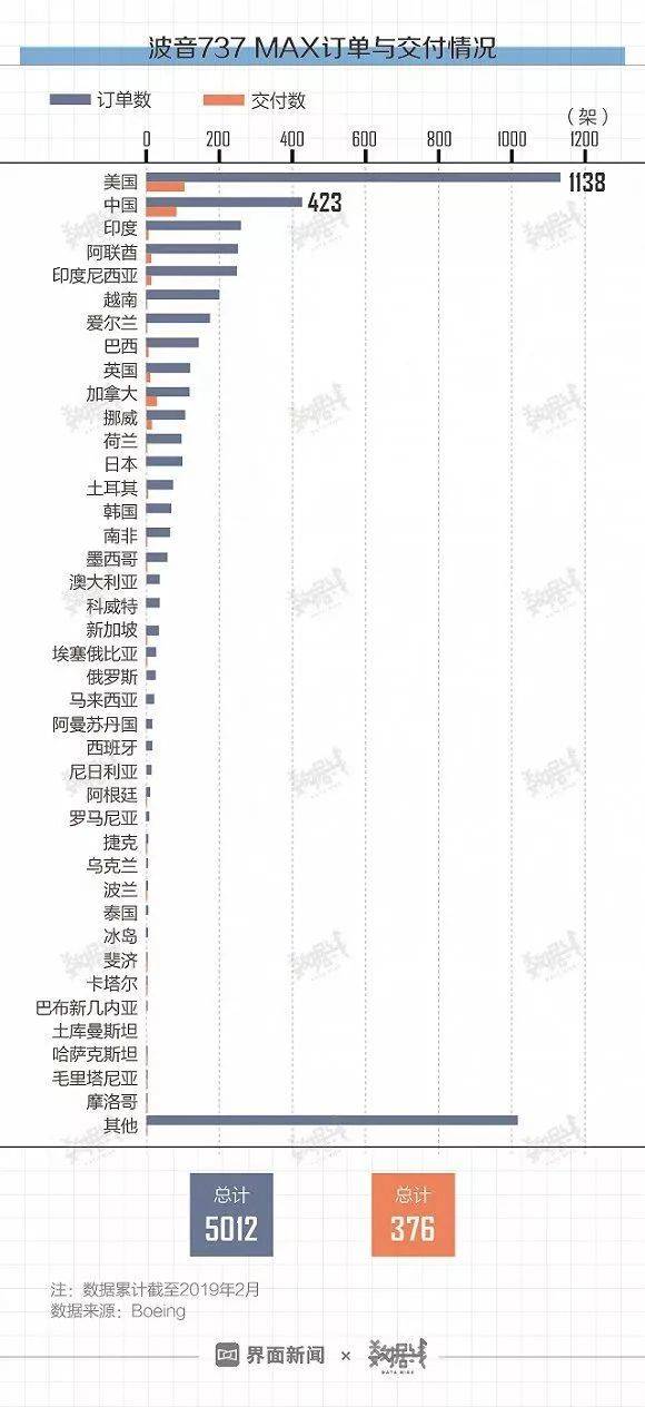 截止2019年2月,全球的737MAX订货量是5012架,最大的订货国家是美国,共1138架,而中国排名第二,共423架。其中已经交付的飞机共有85架,而南航已经收货16架。