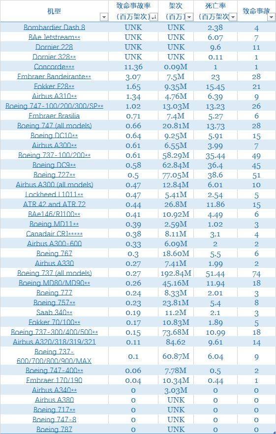 在现有发现的统计中,从来未曾有过死亡记录的机型包括:空中客车A380、350、340、320NEO,CRJ700/900/1000,波音的717(原麦道95)、787、747-8,庞巴迪C系列。另外,安全系数排名靠前的,还有几款波音的飞机,包括了波音737NG,767、777和757。