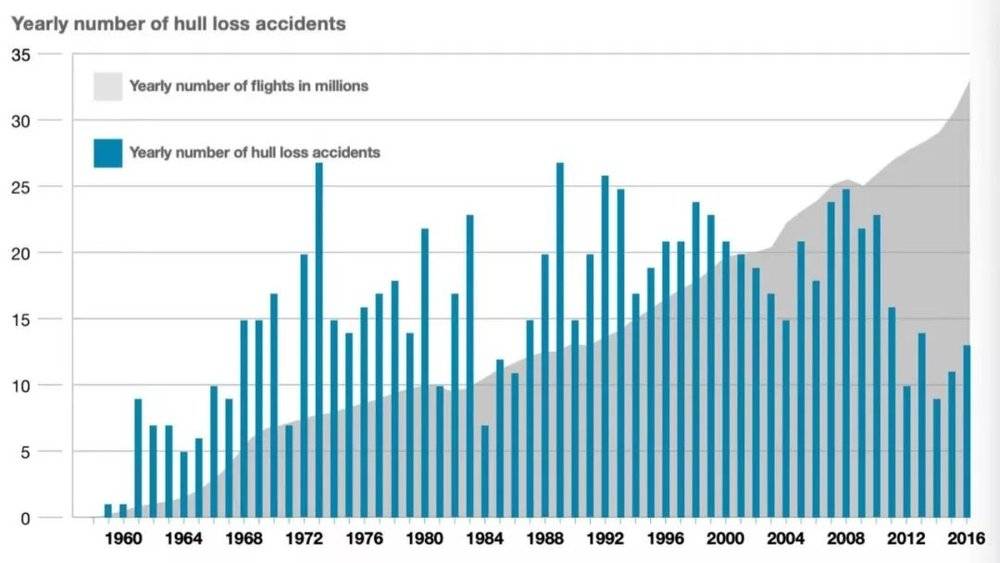 空客在2017年发布的一项研究报告表明,近些年来随着科技的发展,航空事故的发生频率越来越低。从航空专业的角度上,每百万航班的整机损毁率与致命事故率,都在逐年下降。这个调查发生的当年,2017年,甚至到了历史最低水平,全年只有10起空难,全球飞行死亡人数44人。