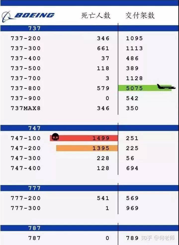 在这个列表中,可以看到波音737的全系列几乎都有过大型的空难事故。747和777尽管看上去都有大量的人员伤亡,但是因为大型客机的载客数量比较大,事故数量虽然少,但是事故伤亡却更加惨重。