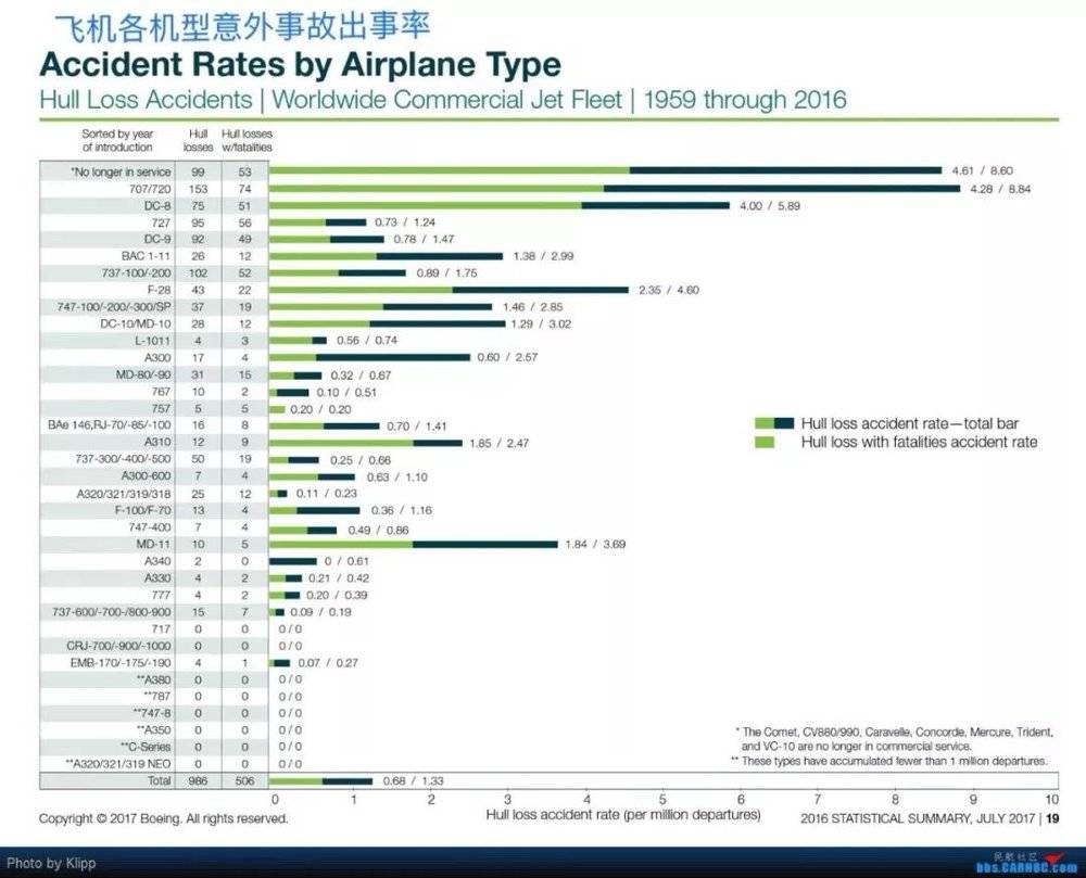 这自然是一个全球性的进步,其中也包括了波音的努力。然而,即便如此,波音的表现在全球航空安全图谱中,也实属难言之隐。波音在2016年的一个调研报告中所显示的数据,统计1959-2016年的空难中,它的机型在整机损毁率中,也是属于突出的。