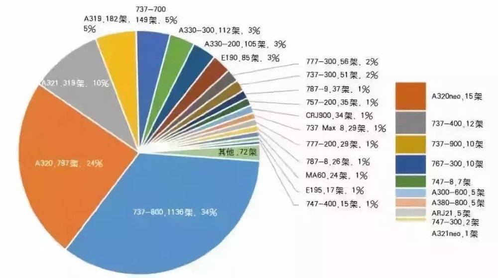 中国的机队和世界各国的机队在组成方面大致思路相同,因此机队的飞机来源是比较集中的。3000多架飞机,只有六家制造商: