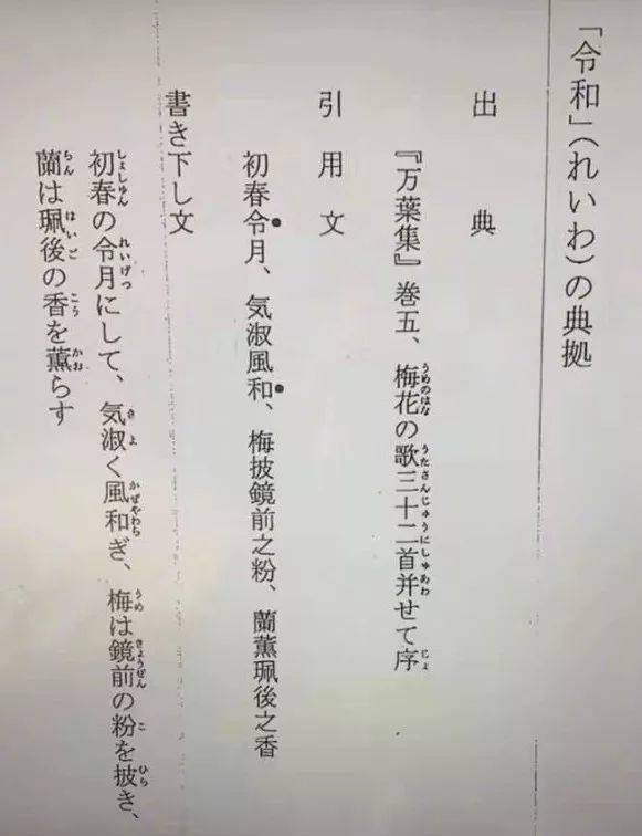 令和二字,根据日本官方解释,出自日本古代诗歌集《万叶集》:“初春令月,气淑风和,梅披镜前之粉,兰熏珮后之香。”