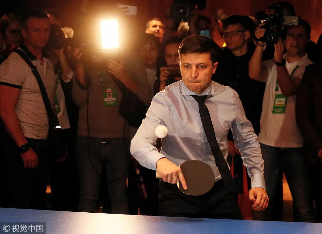 ▲当地时间2019年3月31日,乌克兰基辅,候选人泽连斯基在竞选总部打乒乓球。 图片来源:视觉中国
