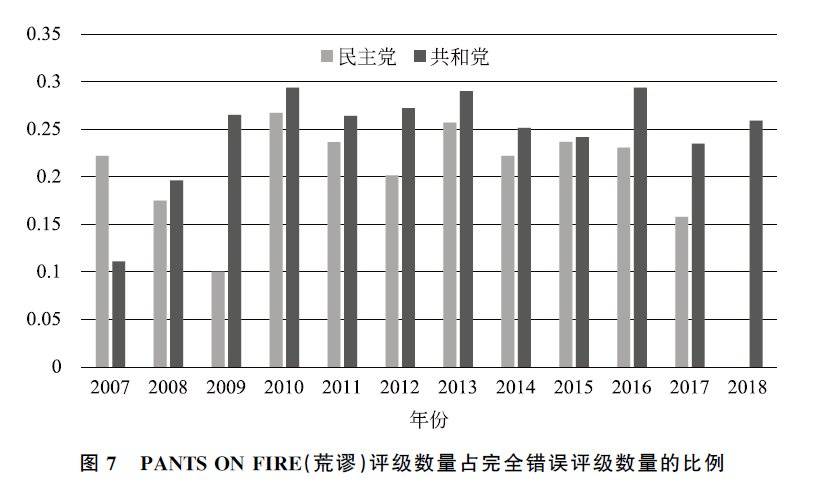 显然,在完全错误的言论中,共和党言论被判定为荒谬的比例在绝大多数年份高于民主党,2018年民主党甚至没有一条言论被判定为荒谬;在真假参半的言论中,民主党被判定为半真半假的比例在每年都高于共和党,而共和党的真假参半的言论更有可能被判定为基本错误(MOSTLY FALSE)。