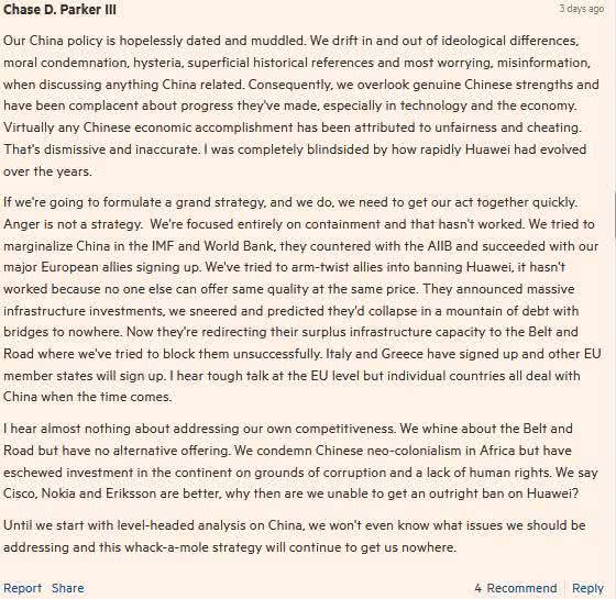 Chase D. Parker III:我们的对华政策是混乱的、过时的,已经无可救药了。当我们谈论任何与中国有关的话题时,我们总是脱不开意识形态、道德谴责、歇斯底里的极端情绪以及对历史的肤浅理解。最令人忧虑的是,我们对中国的实际情况并不了解。因此,我们对中国真正的优势视而不见,当他们取得进步尤其是在科技和经济领域取得进步时,我们总是居高临下地不以为然。我们认为中国所取得的经济成就几乎都是来自不公平的政策和欺骗,这种态度是傲慢的,与事实不符的。这些年华为公司发展速度之快完全出乎我的意料。