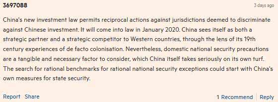 3697088:针对一些国家的外资监管当局对中国投资的歧视性做法,中国刚刚通过的外商投资法允许中国根据对等原则采取相应措施。这部法律将于2020年1月正式生效。中国将自身视为西方国家的战略伙伴和战略竞争者,中国人并未忘记19世纪曾遭受殖民主义者侵略的历史。因此对于中国来说,在国家安全方面加强防范是切实必要的,中国会严肃对待这个问题。在维护国家安全时,若要为应用“国家安全例外条款”(本着国家安全优先的原则,世界贸易组织在WTO协定中设有国家安全例外条款,该条款允许WTO成员在特定情形下,为维护本国的重大安全利益背离其义务或损害其他成员的利益,使成员在追求基本的国家安全利益的情况下能够使用经济手段来达到政治目的。国家安全例外条款为WTO成员提供了在违背WTO基本原则的情况下采取行动的机制——观察者网注)确立一个合理的标准,人们可以看看中国在这方面的做法。