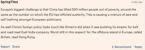 SpringTime:欧洲面临的最大挑战在于,中国成功地使5亿人口脱离了贫困,这个规模已经接近欧盟制造出来的贫困人口数量了。中国取得的减贫成就在欧洲政治家的圈子里引发了一种混合了敬畏和自我厌恶的复杂情绪。另外,中国的外交政策与英国当年建立帝国时的做法有些相似——当年我们创立了东印度公司,如今中国提出了“一带一路”;更糟糕的是,当年我们在亚洲有离岸的香港,如今中国在欧洲有离岸的不列颠。