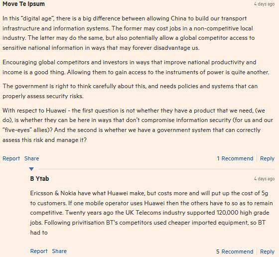 Move Te Ipsum:在当下的这个“数字时代”里,中国给我们建设交通基础设施,还是给我们建设信息基础设施,这两者之间的区别是很大的。前者会使我们不具竞争力的产业损失一些工作岗位,而后者虽然也会使我们损失一些工作岗位,然而允许一个全球性的竞争对手参与敏感的国家信息网络的建设,这将给我们带来长期的不利影响。鼓励全球竞争者和投资人参与我们的基础设施建设、提高我们的社会生产力和国民收入当然是好事情,可是允许他们介入国家权力工具的运行却是完全不同的另一件事了。政府在这方面慎重一些是对的,我们需要合理地评估其中的安全风险。关于华为,首要的问题并不在于它是否能够提供我们所需要的设备(我们的确需要他们的设备),而是在于他们是否能够在不牺牲我们(不仅我们英国,还有我们在“五眼联盟”的朋友们)的信息安全的前提下向我们提供那些设备;第二个问题在于,我们的政府体系是否有能力正确评估使用华为设备的风险并对其加以管控。