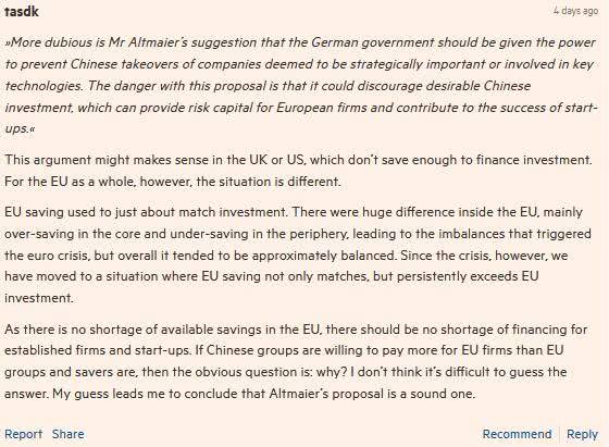 tasdk:“阿尔特迈尔部长提出了一项未必可行的建议,即德国政府应获得授权以阻止中国公司对具有重要战略价值或涉及关键技术领域的德国公司的收购。阿尔特迈尔部长的建议若付诸实施将带来一定风险,因为这将把那些受到欧洲欢迎的中国投资挡在门外,如此一来很多欧洲企业的风险投资来源将被切断,欧洲初创企业的成功率也将下降”——作者的这一观点对于英国或美国来说是有价值的,这两个国家的储蓄率太低,不足以支撑投资。不过对于作为整体的欧盟来说,情况还是不一样的。