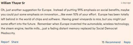 William Thayer Sr:我给欧洲提个建议吧。欧洲把99%的精力都放在社会福利上了,也许可以分一些精力在科技创新上,哪怕10%也行。在芯片和软件这两个产业,欧洲已经完全出局了。拥有漂亮的葡萄园的确很不错,可是也得为未来考虑一下啊!还记得当年是欧洲人发明了汽车、无线电、蒸汽机和纺织机吗?那些已经是褪色的尘封历史了,今天的欧洲正散发着社会民主主义催生的平庸气息。
