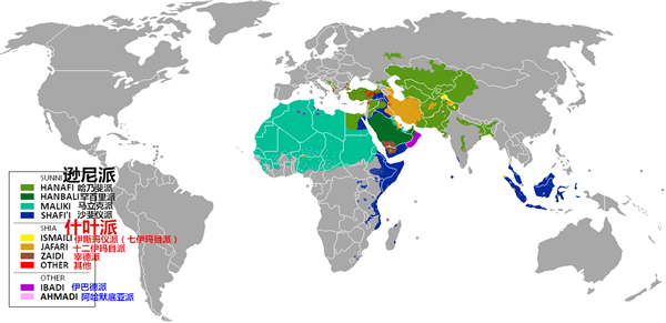 穆斯林占各中东各国人口比例示意图,绿色为逊尼派,紫色为什叶派,黑色为伊巴迪派