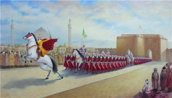 一幅描绘伊斯玛仪进入大不里士城的画作,由Chingiz Mehbaliyev绘制