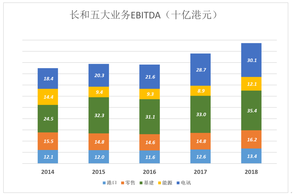 电讯业务包括欧洲3集团及和记电讯香港,2018年EBITDA达315亿港元,是长和旗下第二大赚钱业务。
