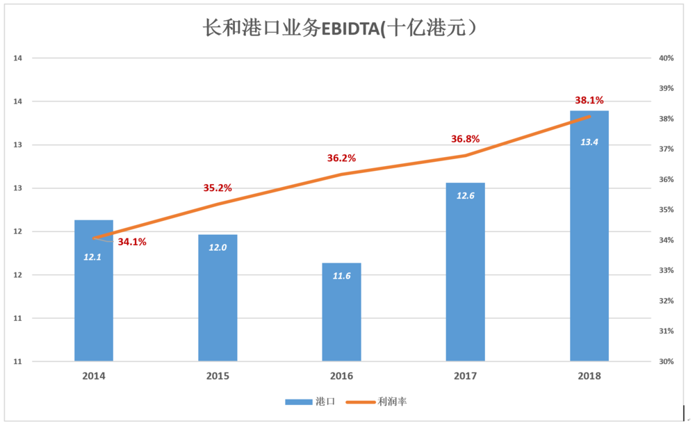 港口业务利润率稳中有升。2018年EBIDTA达134亿港元,同比增长6.6%,利润率38.1%。