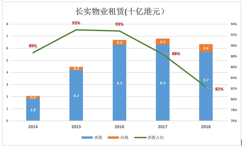 截至2018年末,长实在香港持有用于出租的写字楼、商场总面积约56万平米,而在内地只不到20万平米(北京东方广场80万平米中的一小部分)。