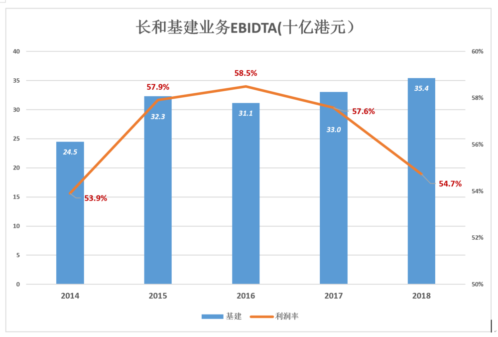 基建是长和旗下利润率最高的业务。2018年基建EBIDTA达354亿港元,利润率54.7%。