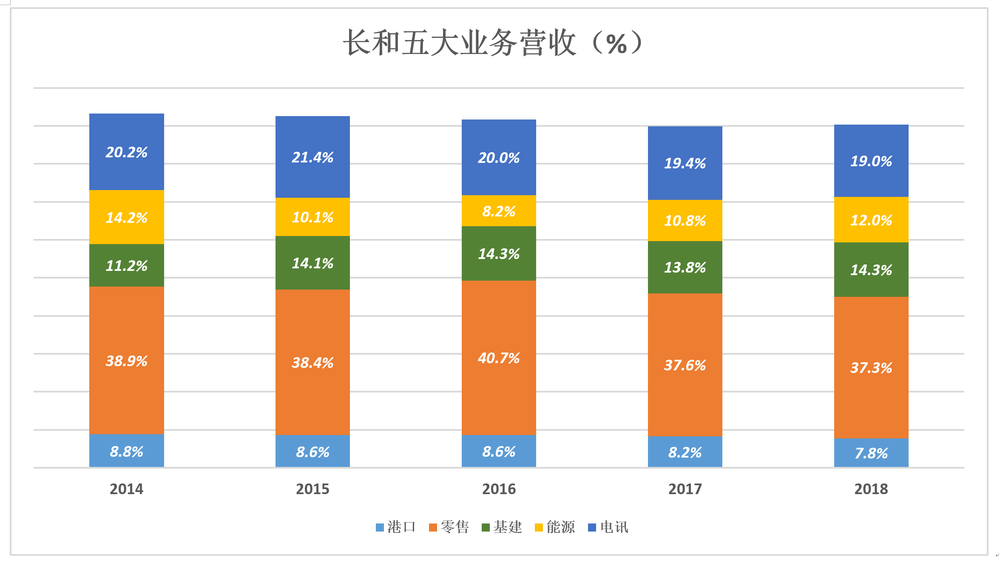 长江和记实业(以下简称长和)旗下业务分为五大板块: