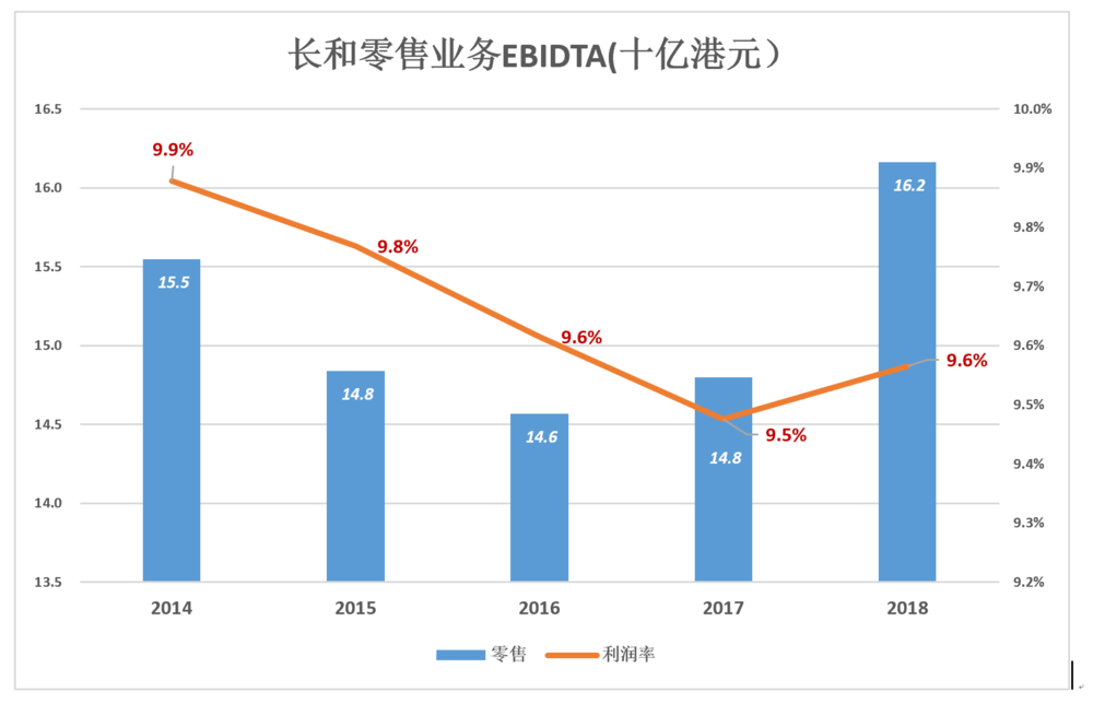 零售业务在长和营收中占比很大,但商品销售利润率不会太高,EBIDTA利润率在10%以内。2018年,零售业务EBIDTA达162亿港元,同比增长9.2%,利润率为9.6%。