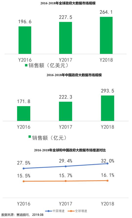 3. 政府大数据市场是指国务院各部委和地方各级政府所采购的与政府大数据相关的软件产品和应用服务所对应的IT支出。2018年全球和中国政府大数据市场保持高速增长。从全球来看,美、英、中、澳等国相继出台实施专项政策和行动方案,推动政府大数据稳步发展。2018年,全球政府大数据市场呈现持续快速增长趋势,市场规模达到264.1亿美元,增速16.1%。依托数字中国和新型智慧城市建设,国务院各部委和地方各级政府大力推动大数据产品和服务在实际业务中的应用。据赛迪顾问统计,2016-2018年中国政府大数据市场规模增速是全球增速的近2倍。市场规模达到293.5亿元,同比增长32%。