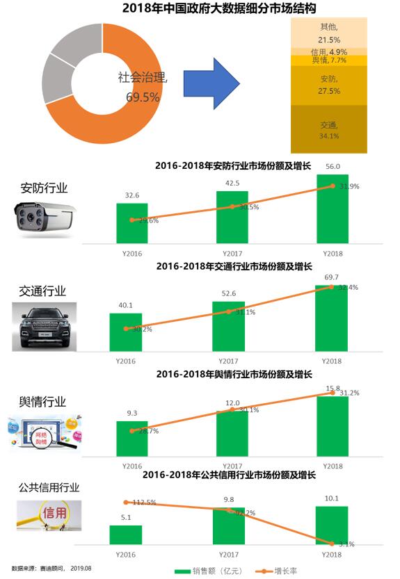 4. 在社会治理领域,2018年社会治理市场规模占政府大数据总市场规模的69.5%。其中,受益于雪亮工程、智慧交通、天网工程等项目落地,交通、安防、舆情领域热度不减。2016-2018年安防、交通、舆情三个细分市场保持高速增长。2018年三者累计占比69.3%。