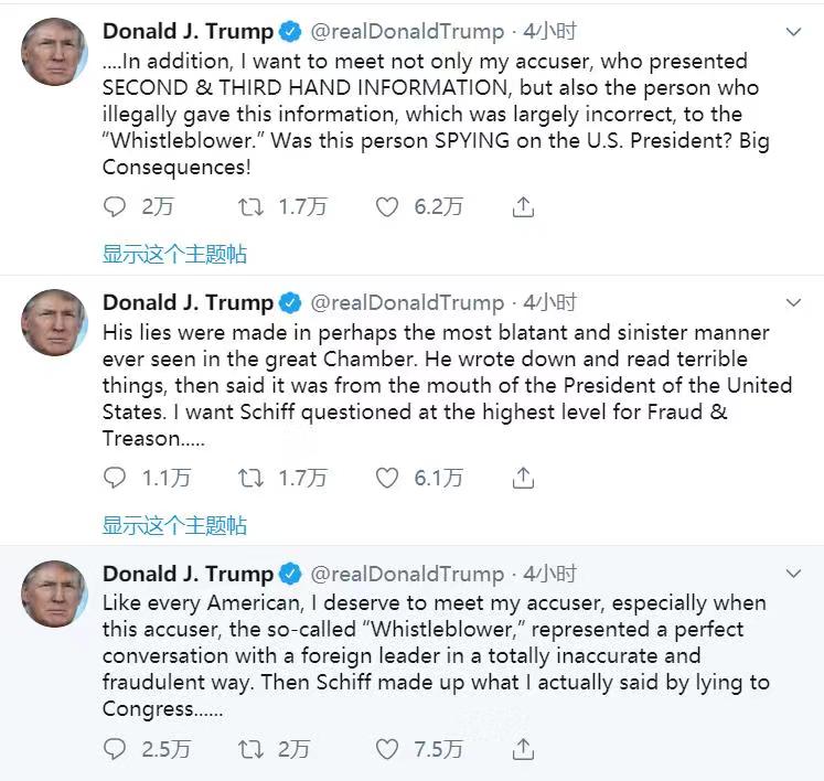 特朗普要求与“提供第二手和第三手信息”的举报者,以及向举报者爆料的人见面,并指后者对他从事间谍活动,“后果很严重!”特朗普称目前所发现的一切都“没什么可弹劾的”,并指美国建国领袖们设计程序时让弹劾极为困难。