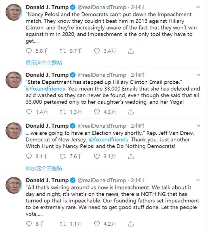 ▲ 特朗普在推特上痛批民主党人的弹劾调查。