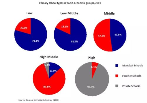 2016年,智利两所最顶尖大学招录的公立学校新生中,19所全国公立重点高中就占了一半,这些公立重点中学还勉强维持着公立学校的些许体面。但私立学校已经成为精英学校的代表了,这两所最顶尖大学的新生中,只有18%来自于公立学校,换句话说,82%学生是来自私立学校。