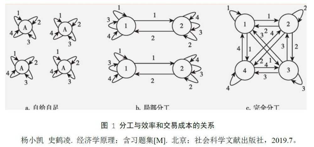 因此,加入交易费用之后,图1的分工就可以解释为,a自己自足状态,每个人生产自己所需的产品,没有交易费用。b局部分工状态,每个人生产部分商品,市场仍然存在区隔,交易在部分人群中发生,交易开始产生费用。c完全分工状态,每个人只生产1种商品,交易在任意两人之间发生,交易成本相比b大幅提升。