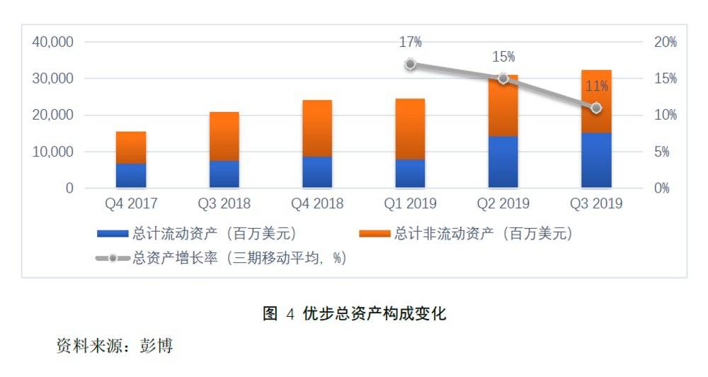 但是我们看实践中,即便是平台化运营的共享经济,也难以真正实现轻资产运营。如图 4所示,我们看经移动平均处理后,优步的季度总资产增速超过10%,增速并不缓慢。其中2019年3季度,公司非流动资产为171亿美元,占总资产的53%,这似乎与轻资产的观点相悖。