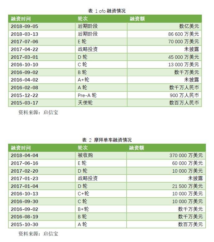 但如果是一个完全竞争市场,情况就很不乐观。为了抢占用户,企业之间会陷入补贴不止的囚徒困境(图 3)。这个时候,企业的融资能力就显得至关重要,在企业实现盈利之前,失去融资的支持,企业很可能就会面临失败。如表 1、表 2分别为ofo和摩拜的融资情况。摩拜被收购距最后一笔融资不到1年的时间。而根据启信宝的数据显示,扩张更为激进的ofo在2019年04月04日被股权冻结,距最后一笔融资同样不足1年时间。